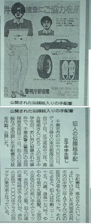 昭和57年6月6日午前11時50分、千葉市横戸町1255の花見川にかかる弁天橋近くの花見川サイクリングロード脇の草むらで少女が首から血を流してうつ伏せに倒れ、もう1人の少女が顔を血だらけにして泣いているのを自転車で通りかかった会社員が見つけた。うつ伏せの少女は死んでおり、喫茶店ウェイトレス(38)の長女で港区立高松中3年の落合雅美(14)で、泣いていた少女は茨城県古河市の中3(14)だった。2人は小学校から中学2年まで古河で同級生で、昨12月から落合だけ港区に引っ越しており、落合は春休みにも家出をしていた。5月29日から落合は中学に行かなくなり、5月30日に古河の中3少女の家に現れて2人して家出していた。落合の死因は右側頚部などを刺された事による失血死でアキレス腱も刺されていた。中3少女も洗車用のホースで首を絞められて顔を殴打されていた。