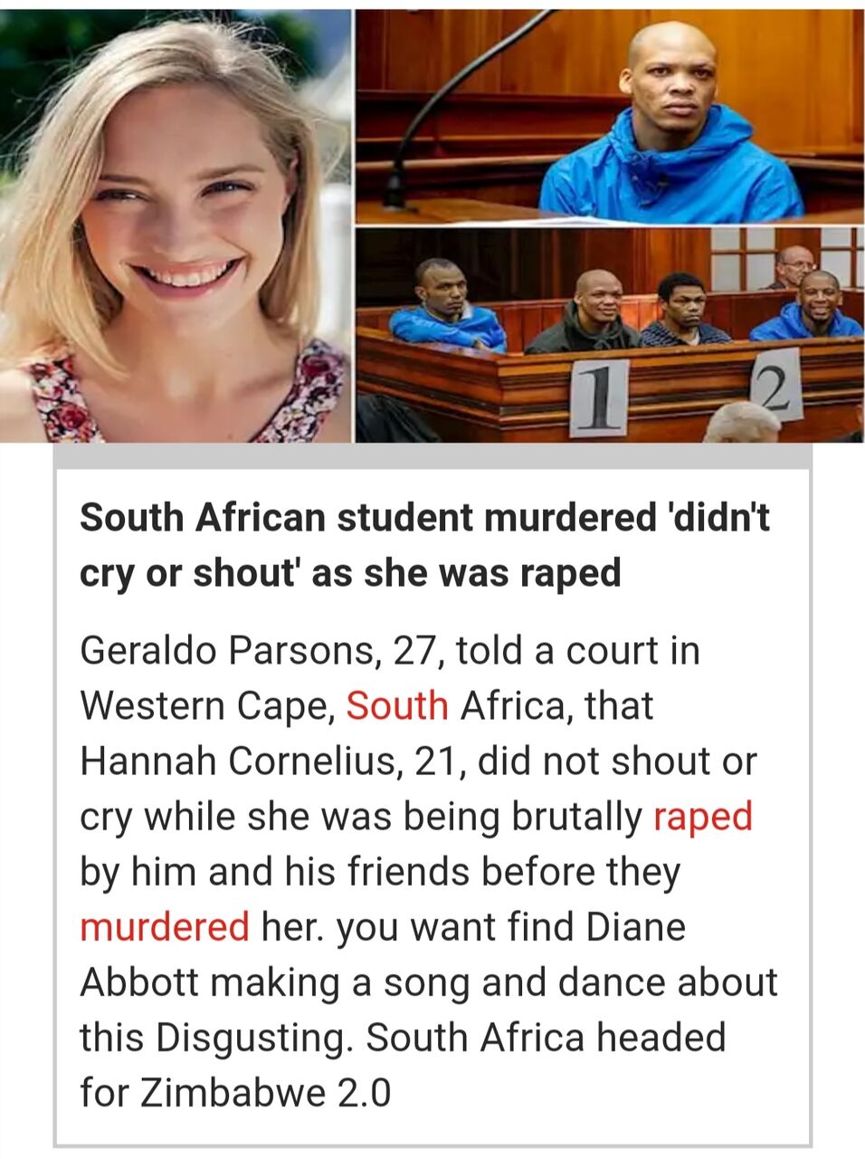 >>21 南アフリカは白人が黒人4人に暴行されて殺害されるとかいう悲惨な事件が起こってるぞ