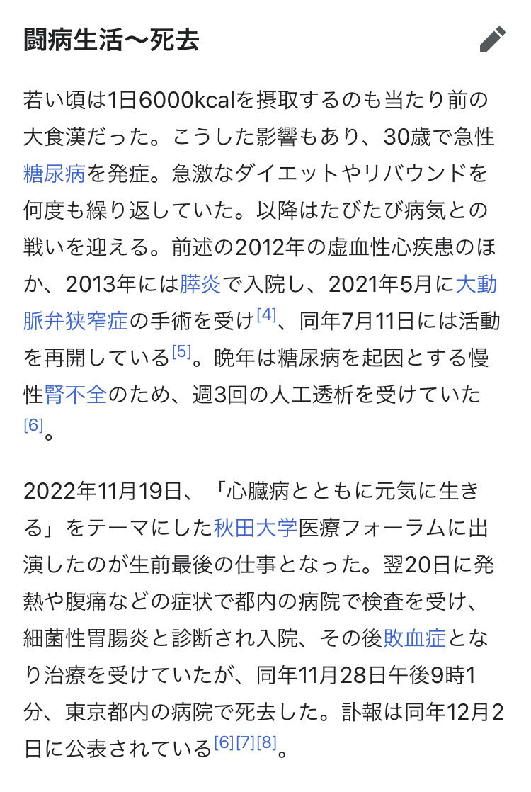 いつもテカテカパンパンの顔でメシ食ってるイメージやから死ぬと驚くわ