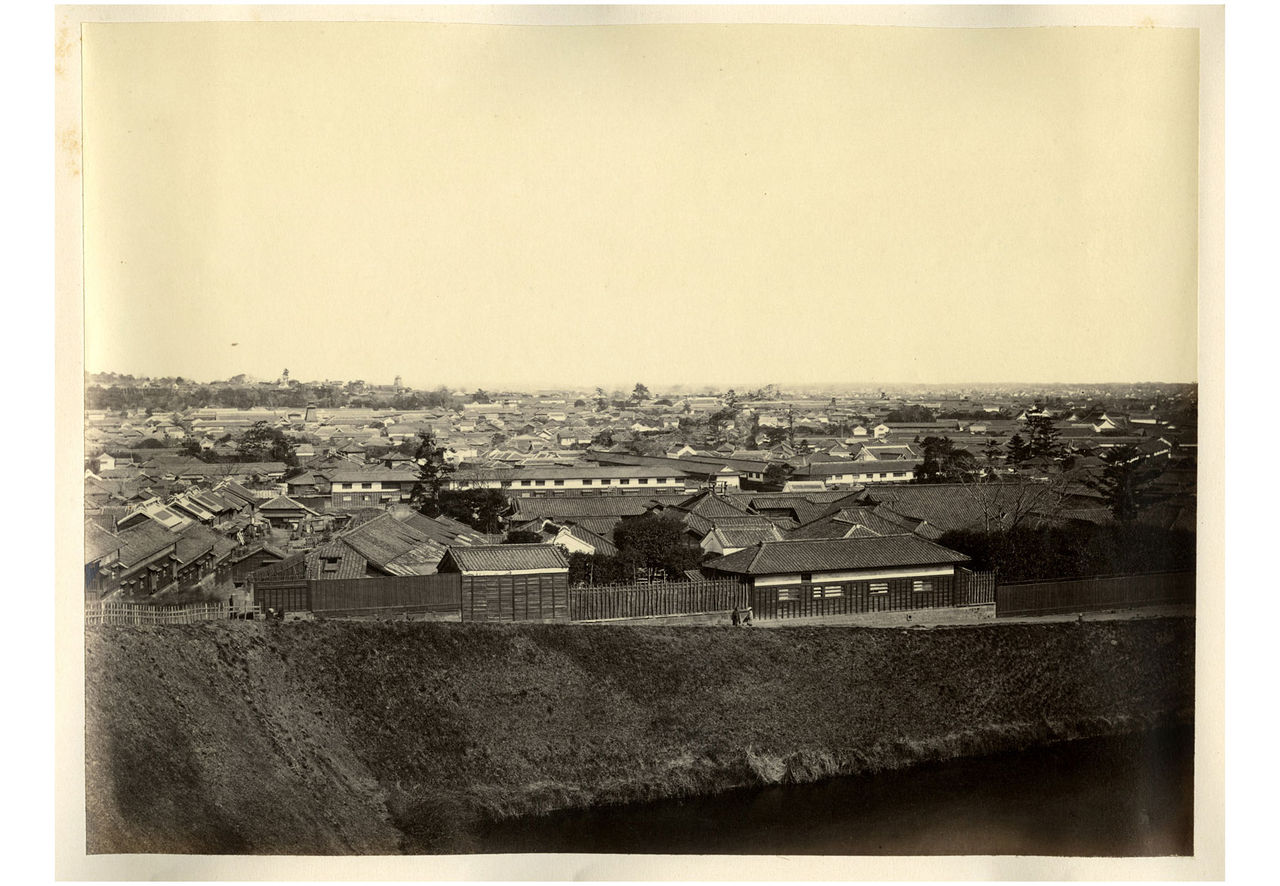 幕末の江戸 堤防沿いで三度笠の2人の武士たちが立ち話している