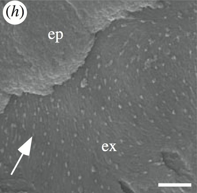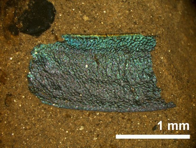 化石は1,500万年~4,700万年前のものだが、構造色という現象のおかげで、その色をいまに残している。光が化合物に反射して発色する色素と違い、構造色は、光とナノスケールの表面構造の相互作用によって生み出される。