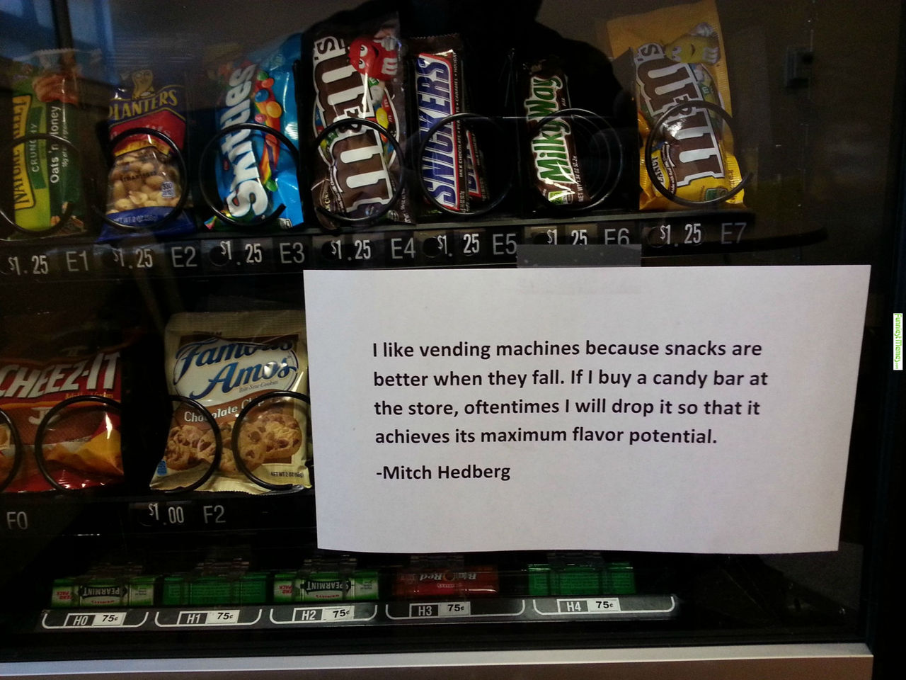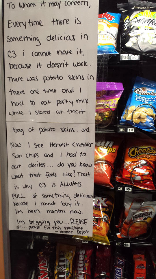 I like vending machines because snacks are better when they fall