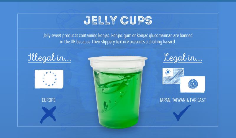 一時生産が中断されたことがありました。ヨーロッパでも同じ理由で、現在もゼリー菓子の材料にこんにゃくを使用すること自体が禁止されています。