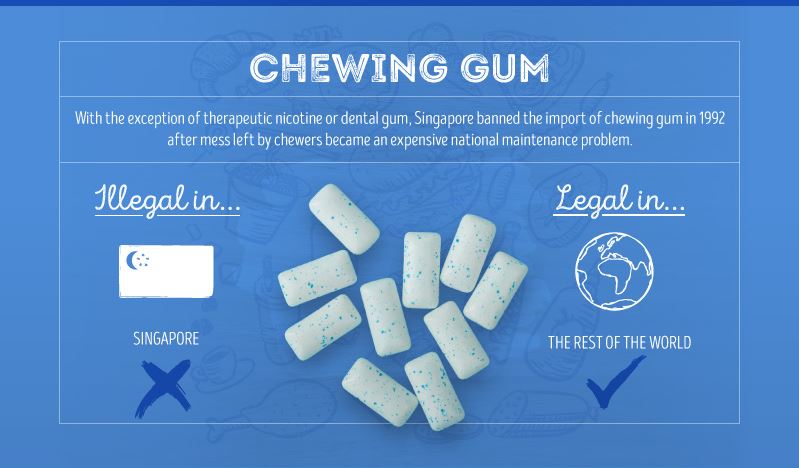 容認国 : 上記以外 ニコチンガムとデンタルガムを除いて、シンガポールではチューインガムは輸入すら禁止されています。チューインガムのせいで公共メンテナンスが大混乱に陥ったのがきっかけで、1992年に輸入すら禁止になったのだとか。持っていたら没収どころか捕まってしまうかもしれません。シンガポールは他にも無神論者であることが問題であったり、不思議な決まりが沢山あります。