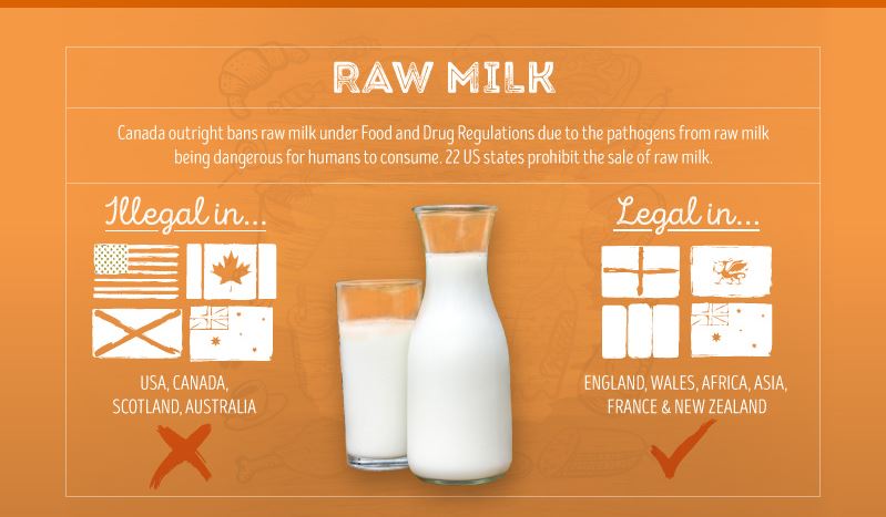 禁止国 : アメリカ、カナダ、スコットランド、オーストラリア容認国 : イングランド、ウェールズ、アフリカ、アジア、フランス、ニュージーランド 日本では牧場などでは、未殺菌の牛乳を売っている場所もあります。上記禁止国では、病原菌が潜んでいることがあるので、全面的に禁止しているようです。