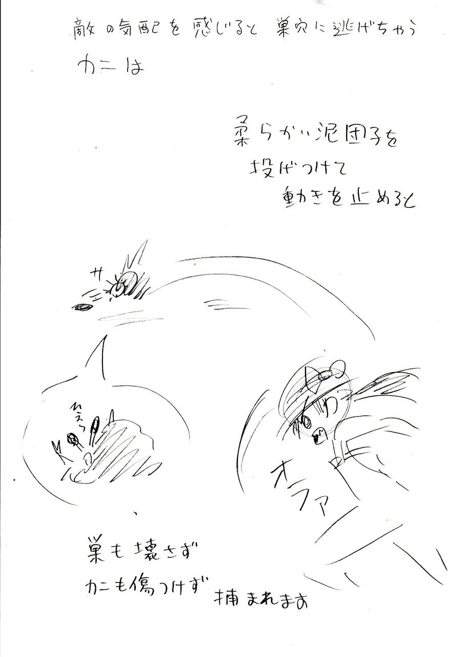 泥団子を投げて、巣に逃げ込んじゃうタイプのカニを傷つけず巣も壊さずに捕らえる必殺技・・・ノーコンだから巣の周辺に泥団子てんこ盛りになりそ