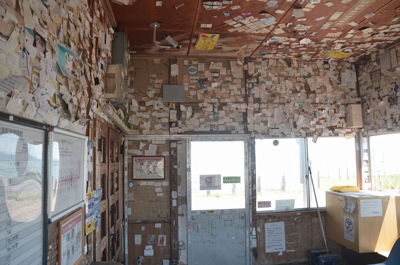 駅舎の中には名刺やら乗車券が大量に張り付けてありました
