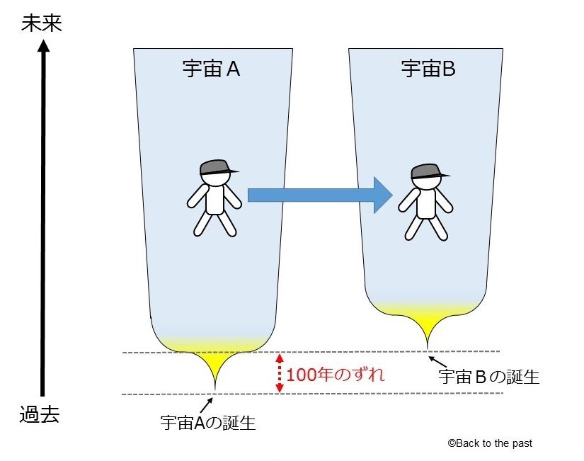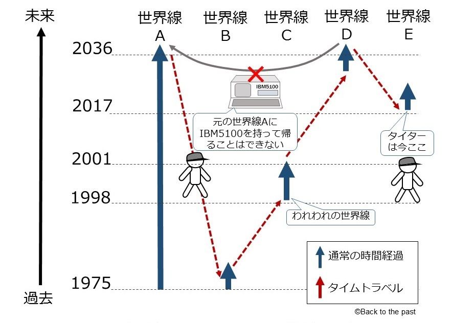 時間軸はそのままでも世界線が変わる(枝分かれしている別世界に流れて元の世界線には戻れない)此処まではOK?