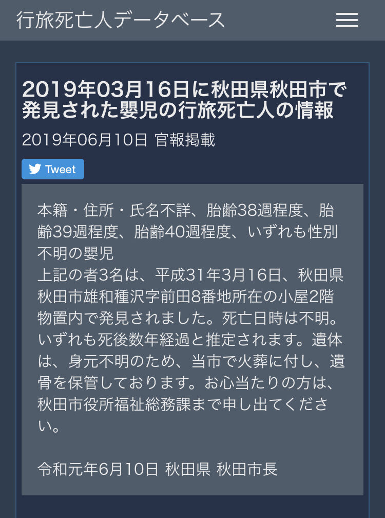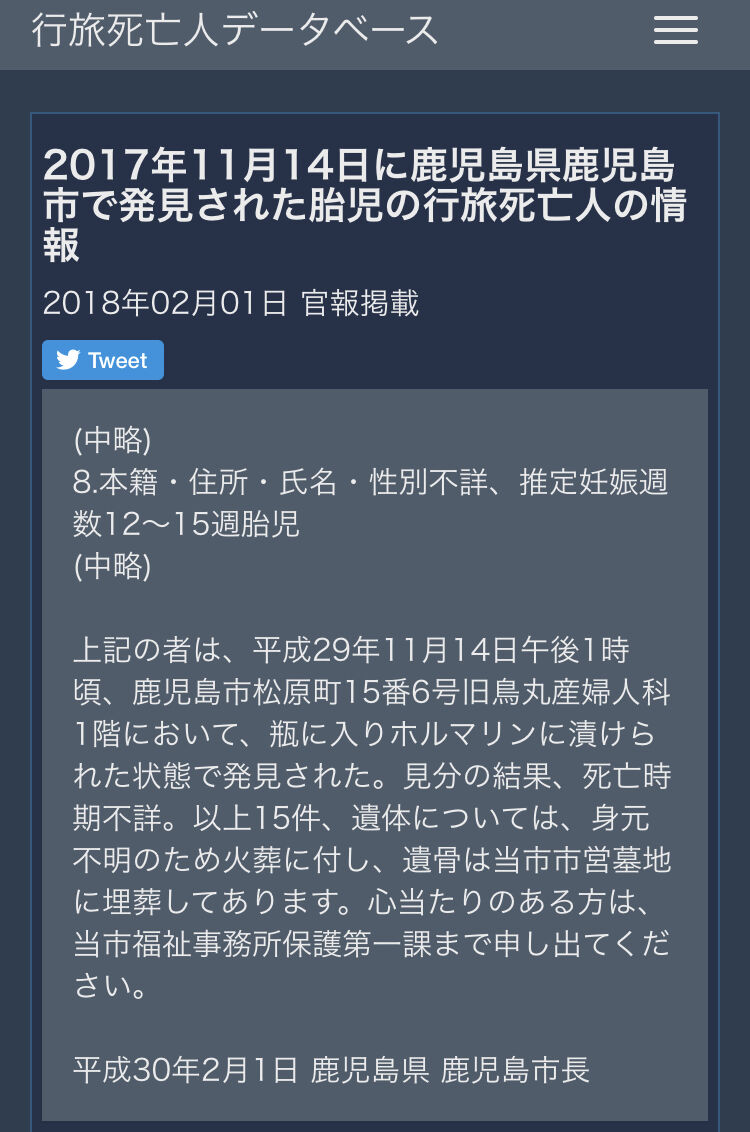 産婦人科が検体目的で胎児を保存してて何年も経って届出とかの関係で行旅死亡人扱いになったとかどうとか